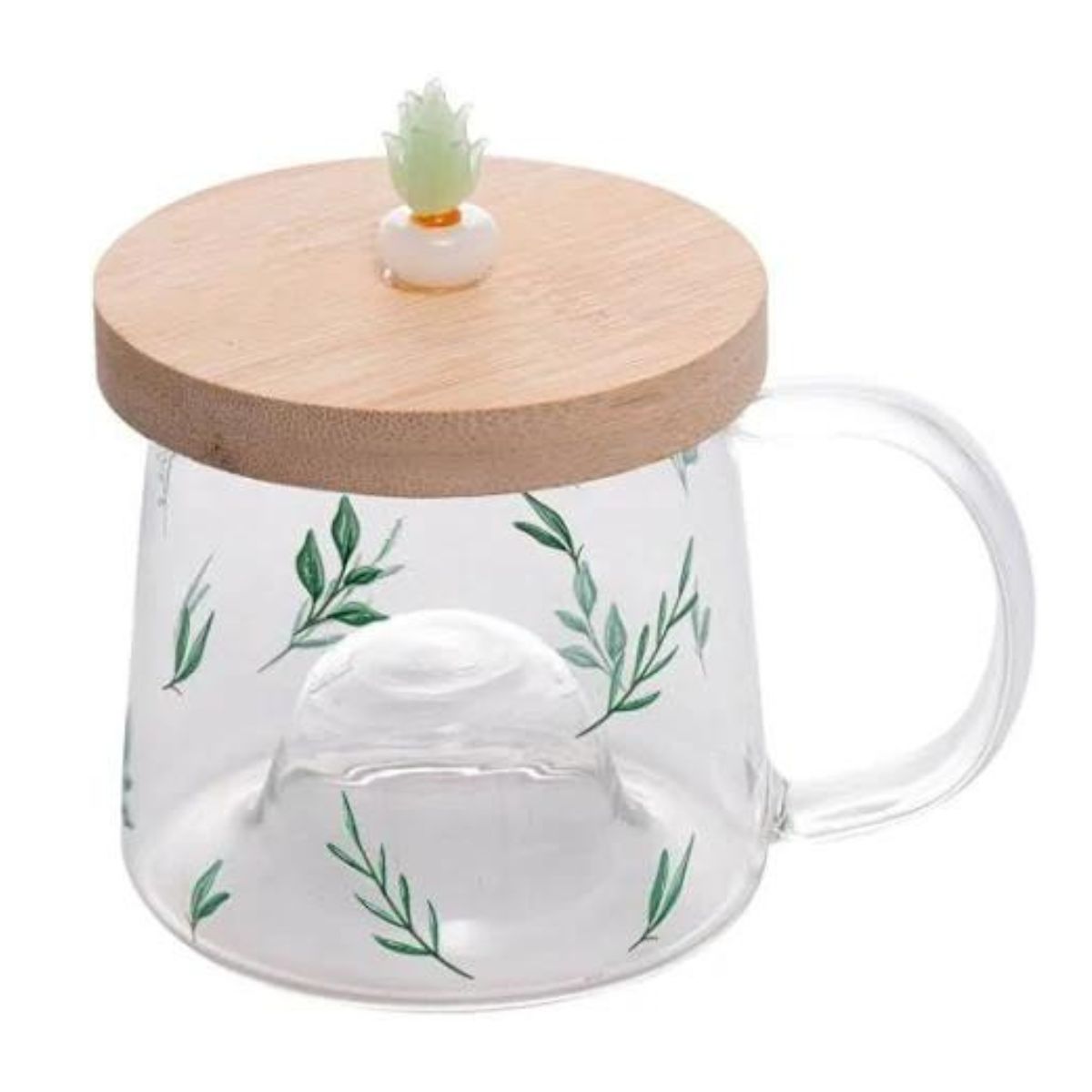 Caneca de Vidro Borossilicato Resistente ao Calor com Pires de Bambu Suculenta 330ml - Lyor