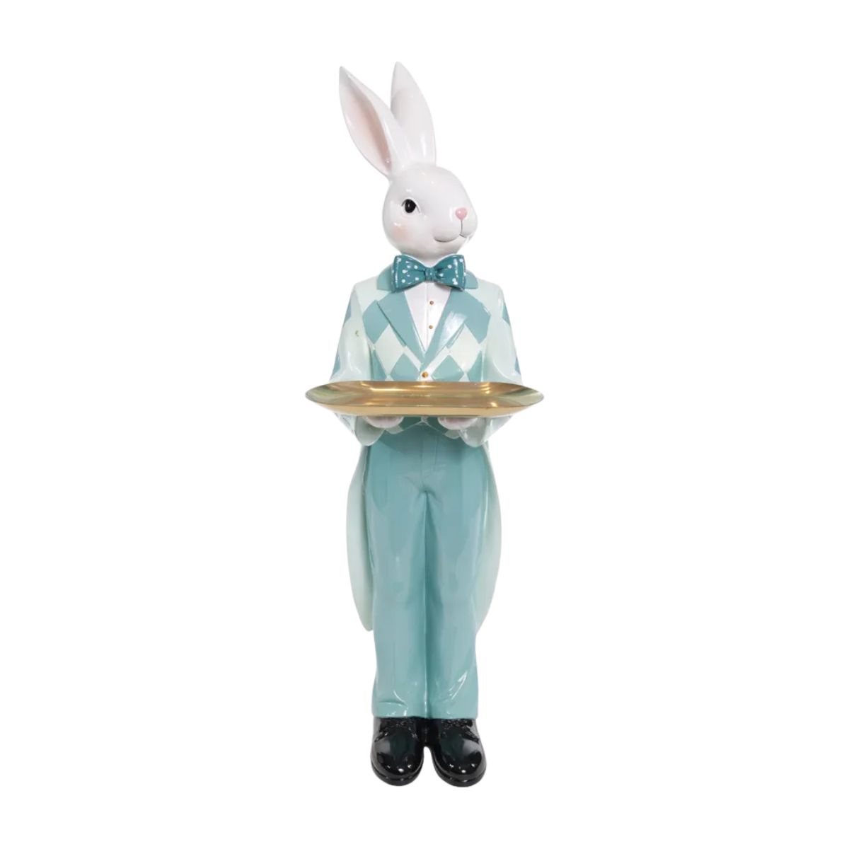 A bandeja integrada adiciona funcionalidade permitindo acomodar doces chocolates ou pequenos itens decorativos com elegancia. Ideal para decorar mesas aparadores halls de entrada vitrines ou cenarios tematicos o coelho se destaca como um elemento central da decoracao.