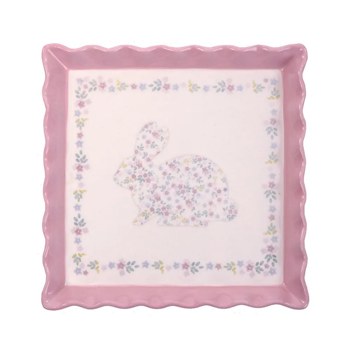 Seu formato quadrado aliado ao detalhe do coelho cria uma composicao harmoniosa que se destaca pela elegancia e suavidade. Perfeita para mesas de almoco jantar cafes especiais ou composicoes decorativas pascais a travessa combina facilmente com diferentes estilos de decoracao.