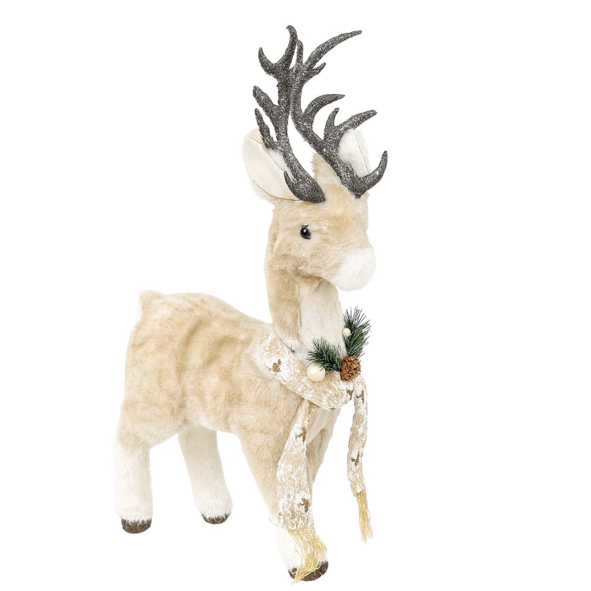 Charmosa rena em tom creme, com textura suave e acabamento delicado. Combina com decorações clássicas e modernas de Natal.