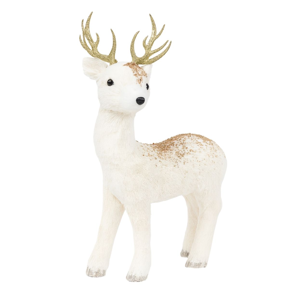 Rena decorativa em pé, com glitter dourado e branco. Toque sofisticado e natalino, ideal para halls, salas e vitrines.