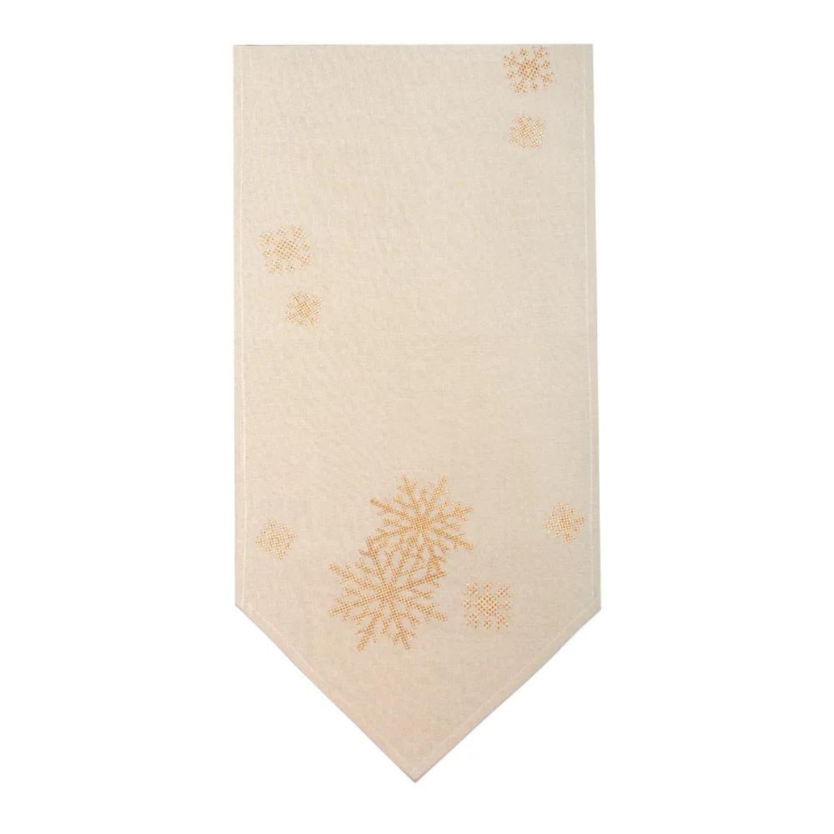 Caminho de mesa com desenhos floco de neve nas cores bege e dourado.