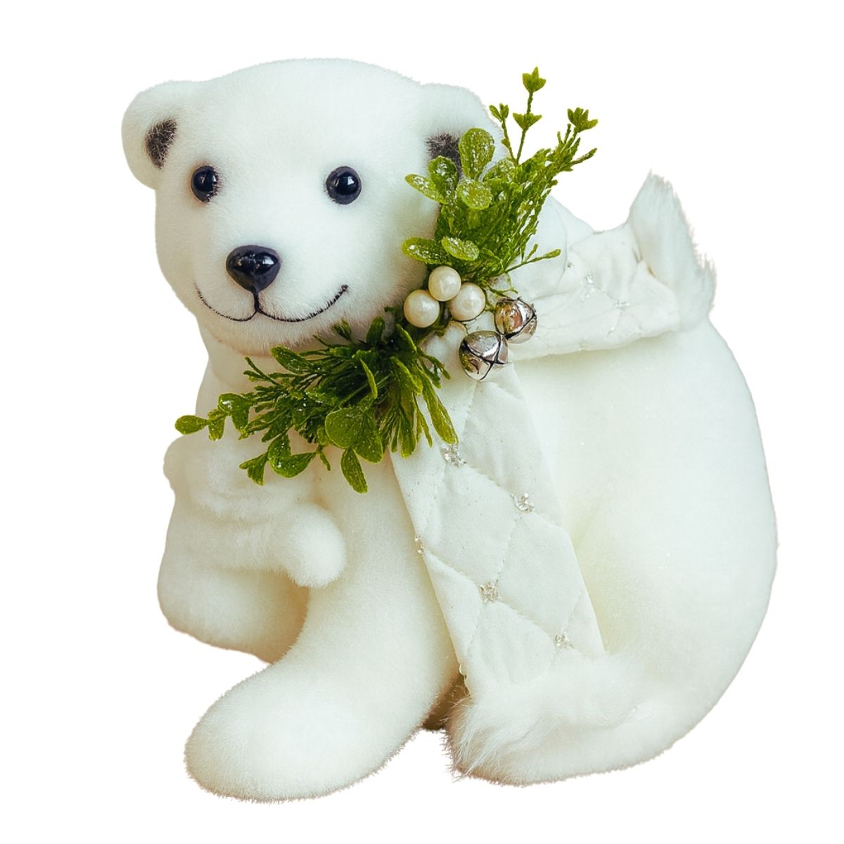 Urso decorativo branco com toque suave e expressão fofa. Ideal para compor decorações natalinas infantis e delicadas.